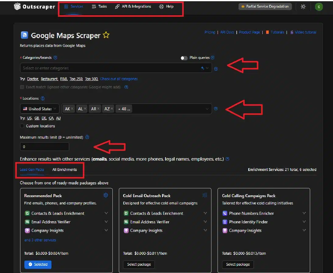 Using the Outscraper interface, create a new scraping task. Input your search parameters, such as keywords (categories/brands), location, and any filters that will help narrow down your results.