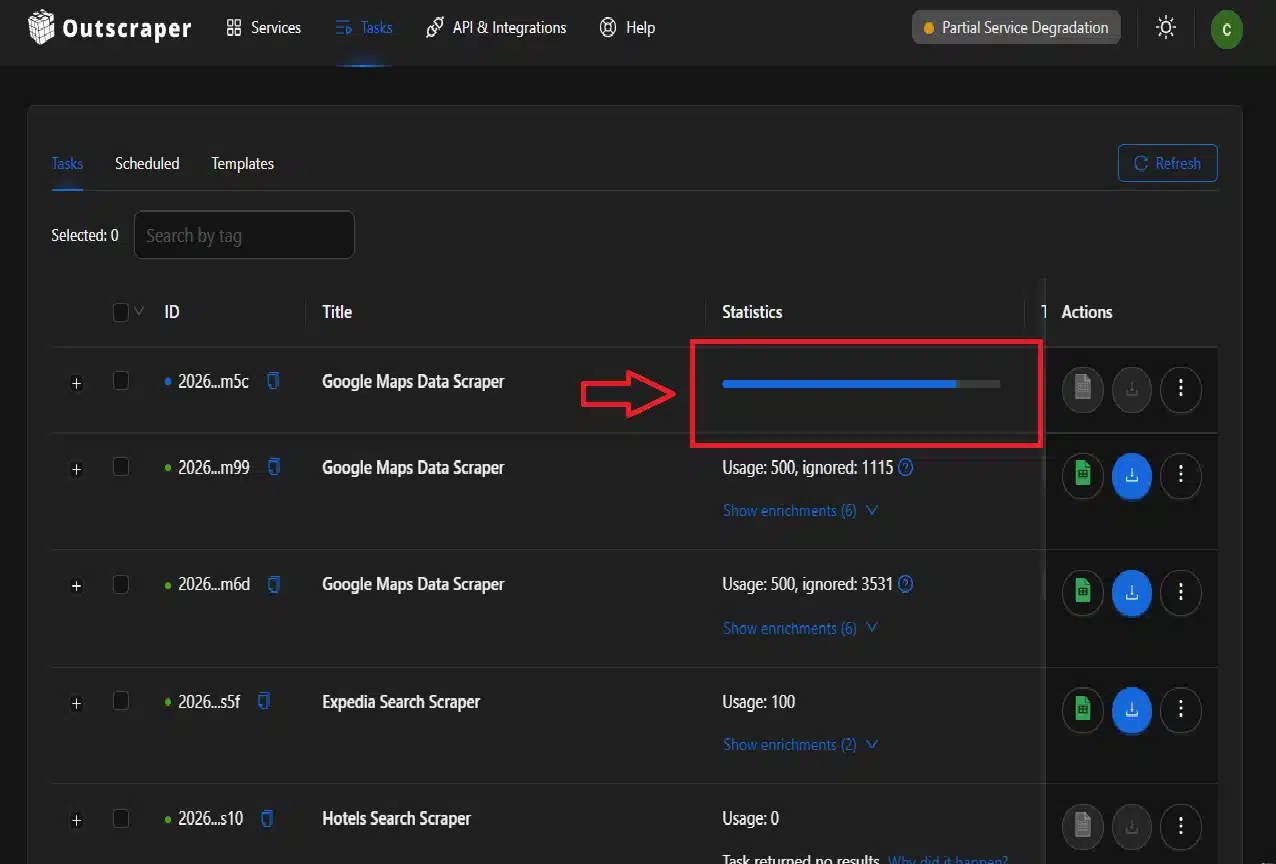 Once your task is set up, run the scraping process. Outscraper will automatically gather the data based on your specified criteria. Depending on the volume of data, this process may take some time. You can monitor the progress through the dashboard.