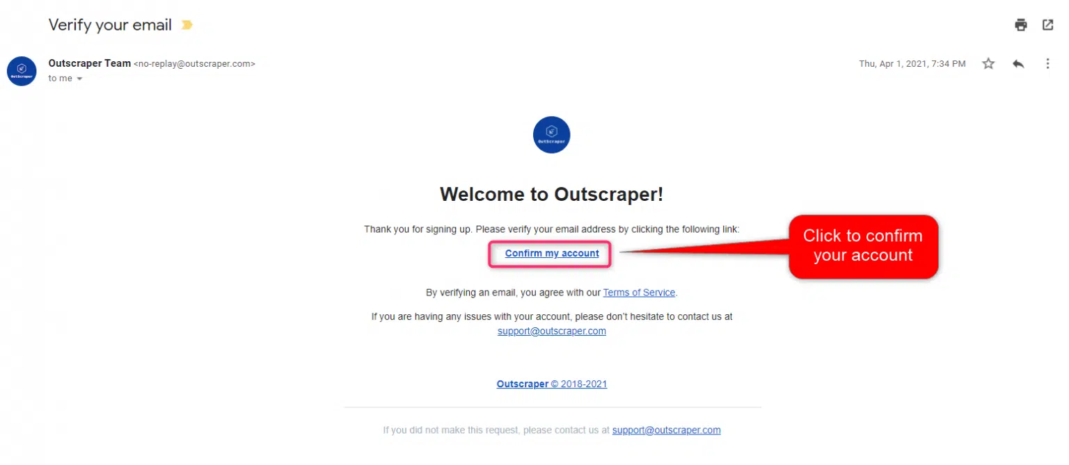 Se le enviará un correo electrónico desde el sitio web de Outscraper para confirmar su dirección de correo electrónico. Haga clic en el enlace del correo electrónico para completar el proceso de registro.