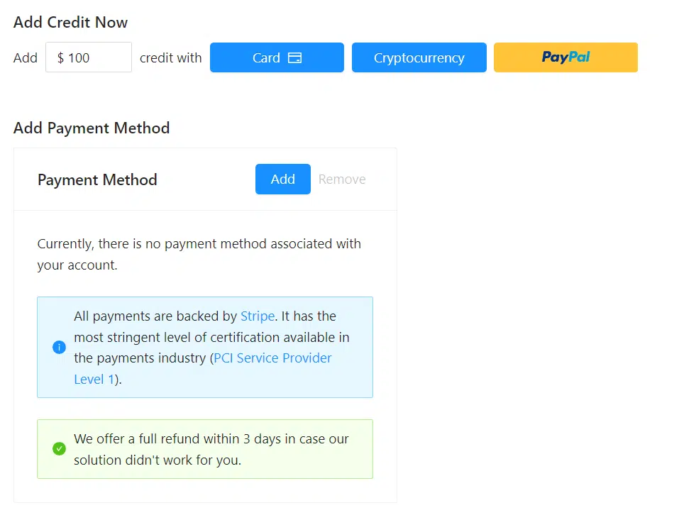 Los créditos pueden añadirse mediante tarjeta de crédito, criptomoneda o PayPal.
