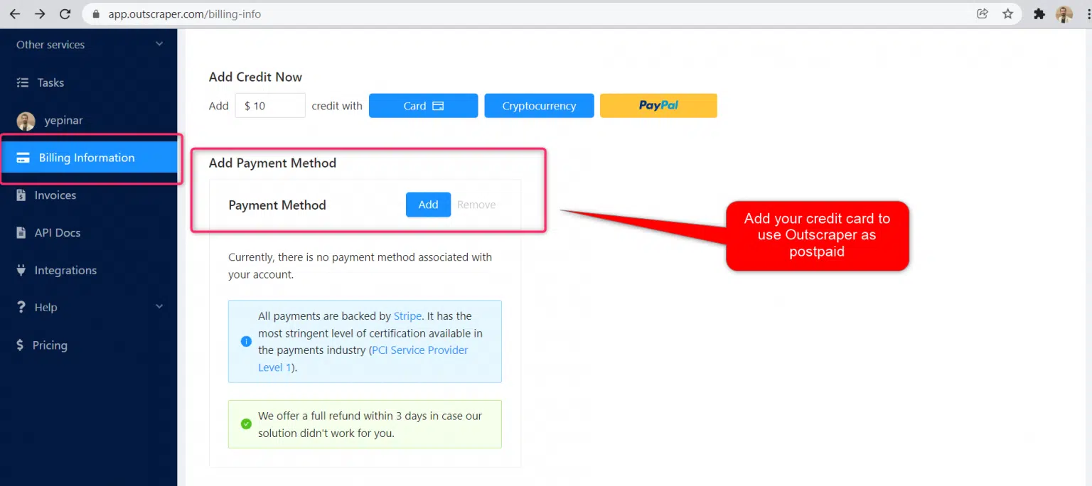 Añada créditos a su cuenta para empezar a utilizar Outscraper. El límite mínimo es de 10 USD. Añada tantos créditos como quiere y gástalos cuando quiere.