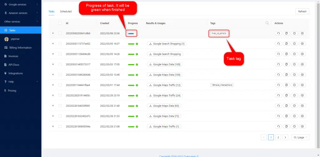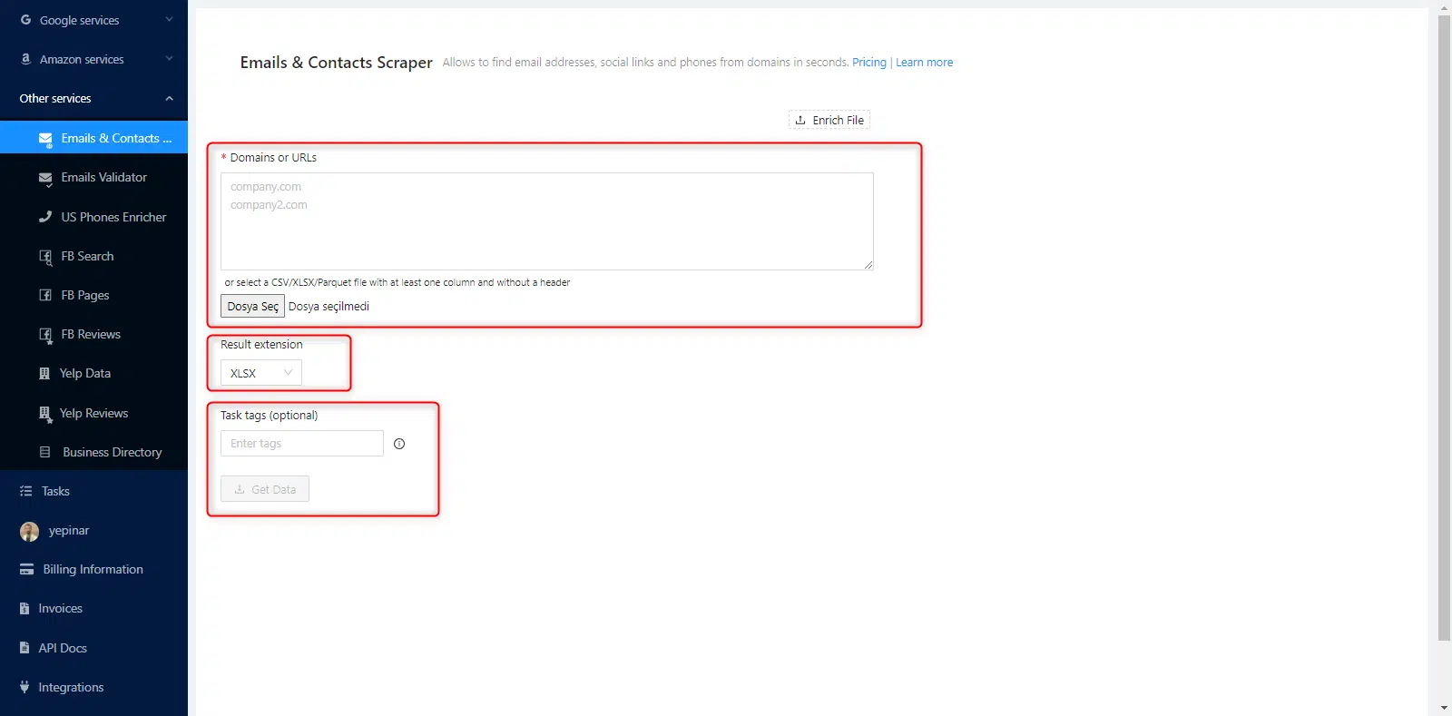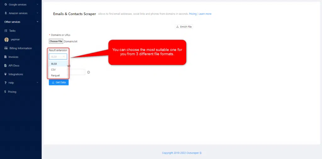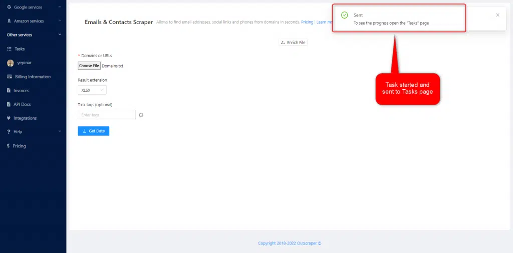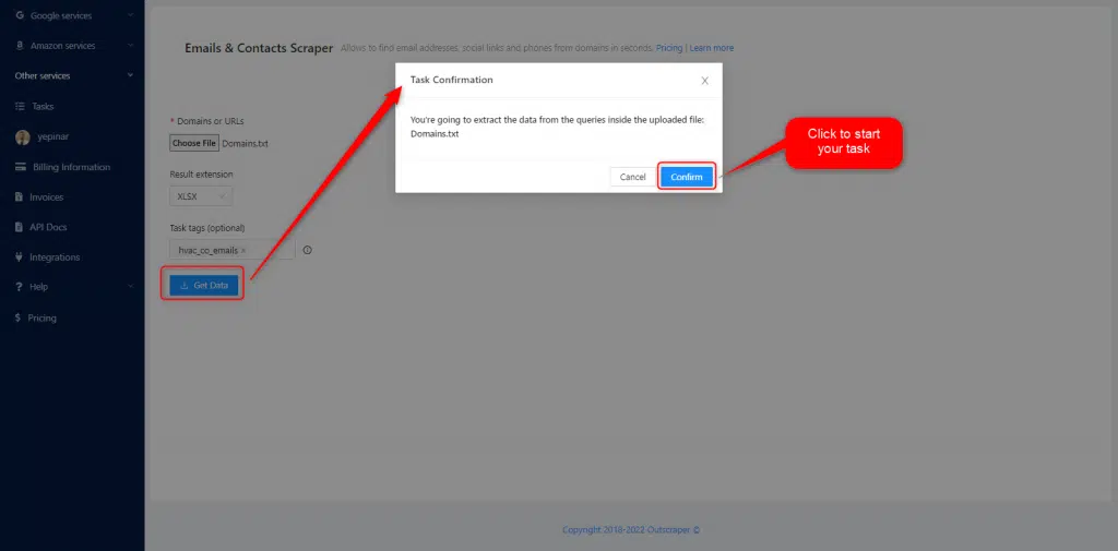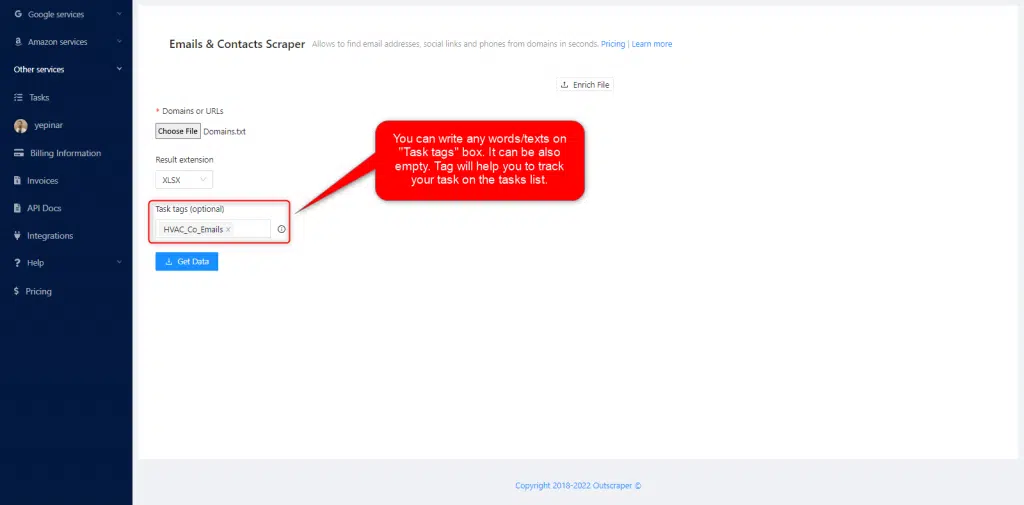 Hay tres parámetros esenciales que debe definirse para crear una tarea. El Email Scraping es muy fácil con Outscraper. Debe comenzar con la lista de Dominios/URLs primero.