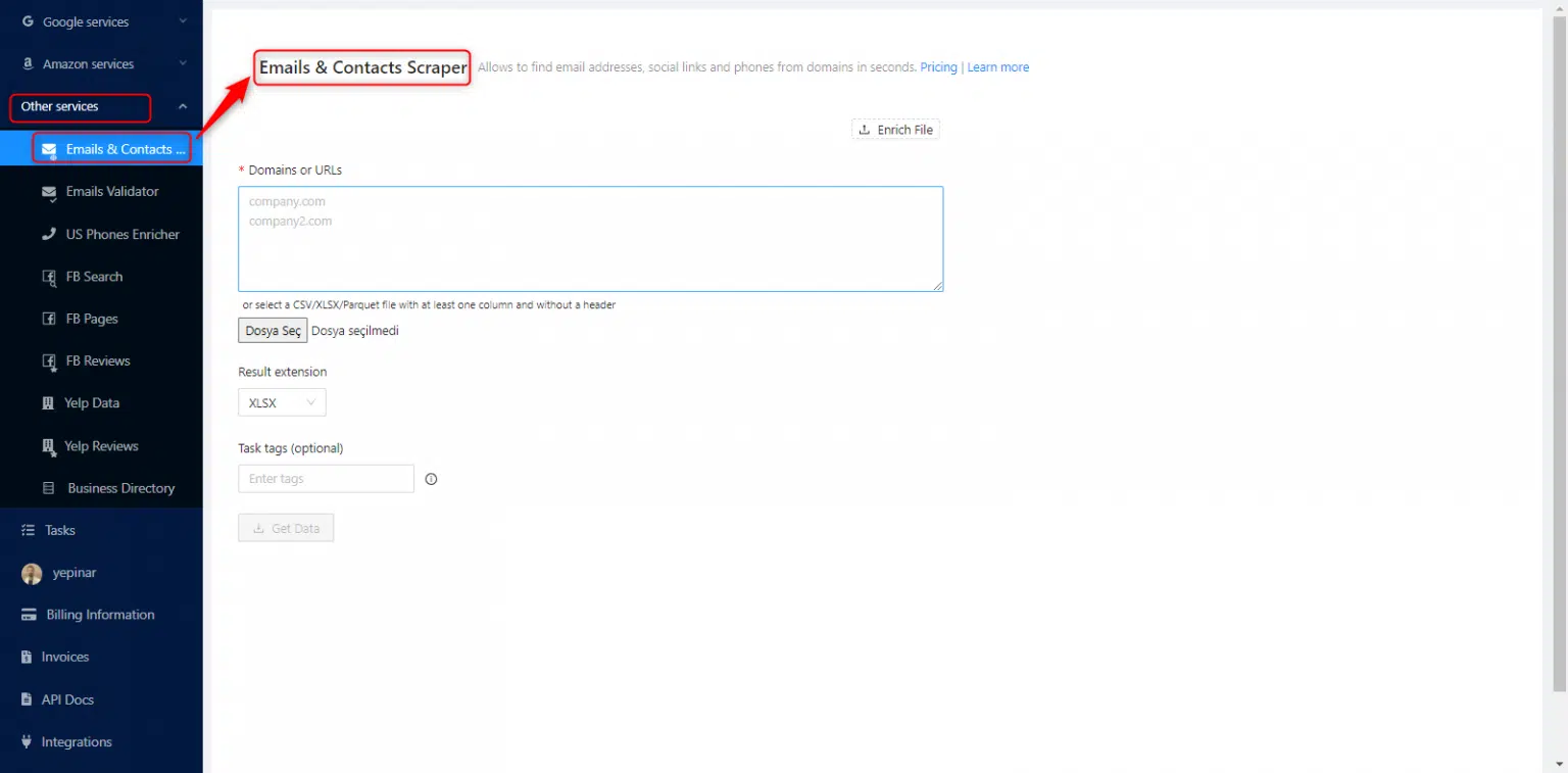 Puede acceder al servicio de Email scraping en el panel de control. Haga clic en Servicios>El Scraping de correos electrónicos y contactos desde el panel izquierdo y abra el servicio El Scraping de correos electrónicos y contactos .
