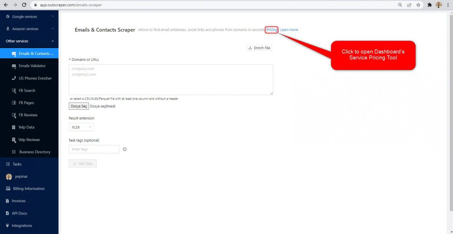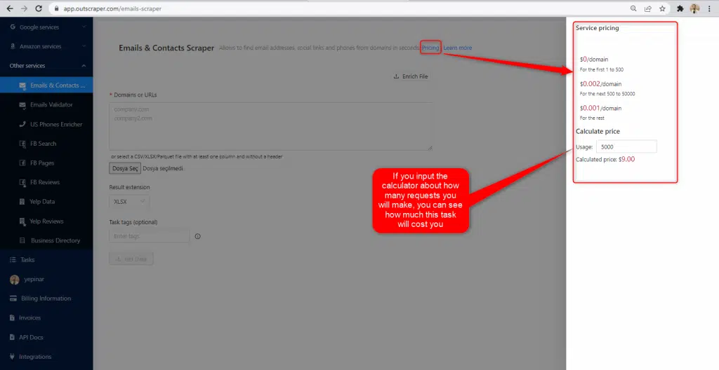 Tras el registro, la herramienta "Precio del servicio" puede ayudarle a fijar el precio en la página del servicio Emails & Contacts Scraper en el panel de control de la aplicación Outscraper.