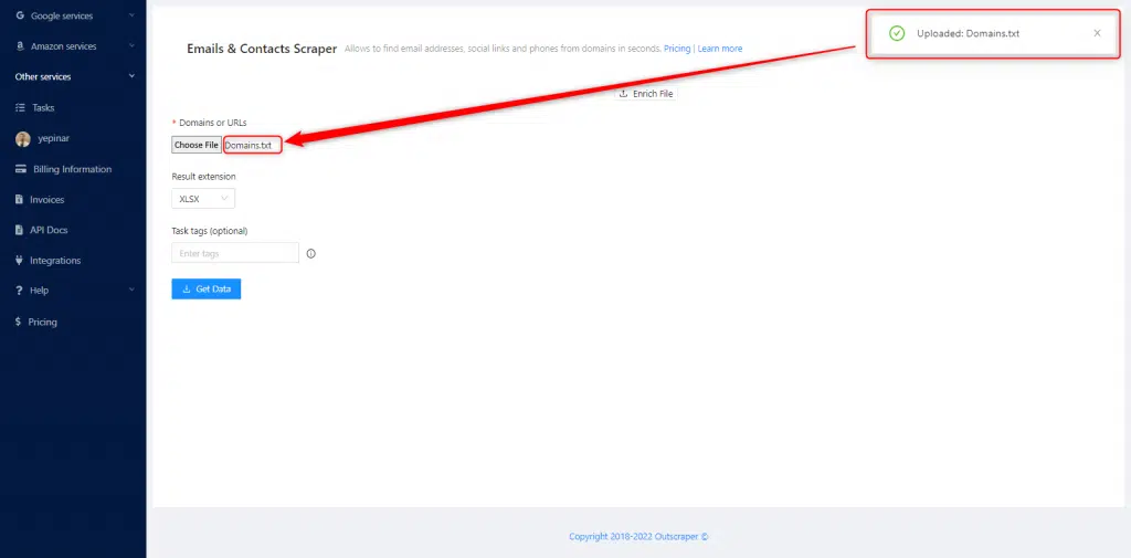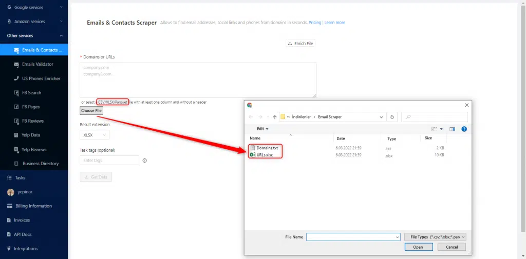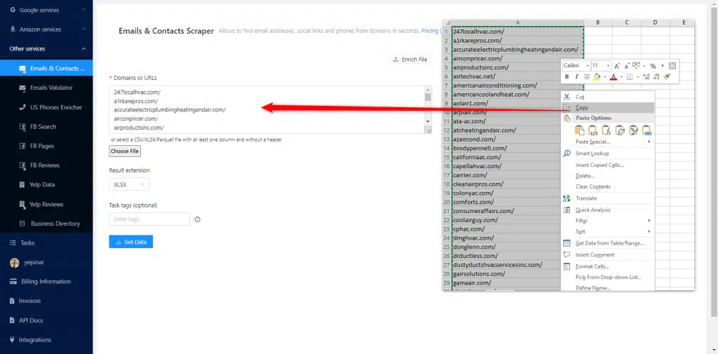 Puedes hacer el scraping de emails con dos métodos diferentes en Outscraper. El primero es copiar y pegar toda la lista en el panel de control. El otro es subir la lista de URLs directamente.