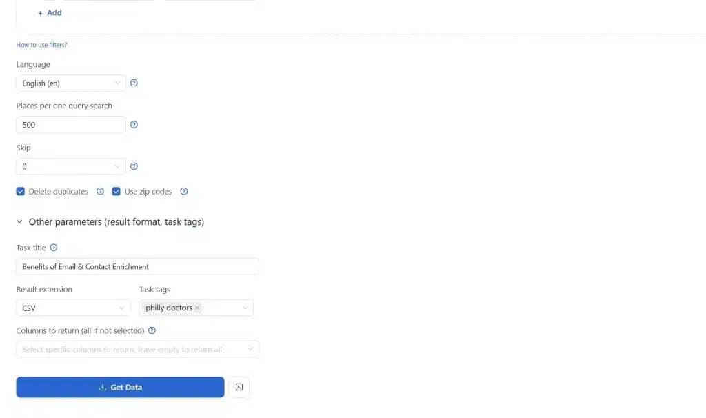 These are the last few steps you should take if you want some extra clarity with the data that you want to download. In this step, you can select the Language, Places per query search. You can also skip some data. There is also an option to delete duplicates. You can also determine what type of file or extension you want before downloading.