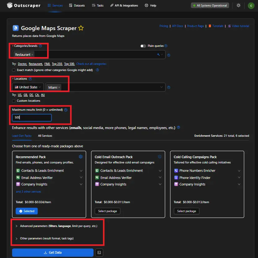 After defining your ICP’s, use Outscraper (Google Maps Scraper) and use the available filters. It consists of categories/brands, location, maximum results, advanced parameters, etc.