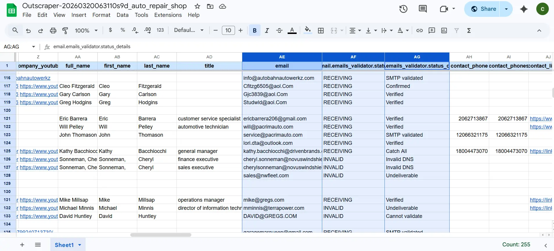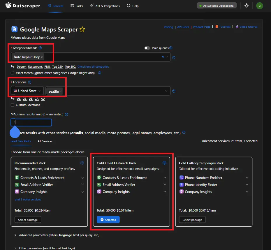 Use Outscraper to extract niche-specific leads. For instance, an auto repair shop in Seattle. Filters are based on categories/brands and location. Add enrichment for the specified needs, just as the Cold Email Enrichment Pack, which was designed for effective cold email campaigns.