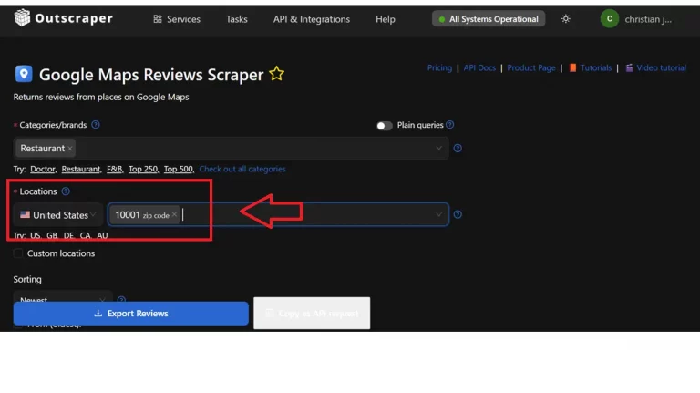 Using Google Maps Review Scraper by Outscraper to have a comprehensive dataset for market analysis. Follow these three simple steps: defining your category, pinpointing the location, and exporting data.