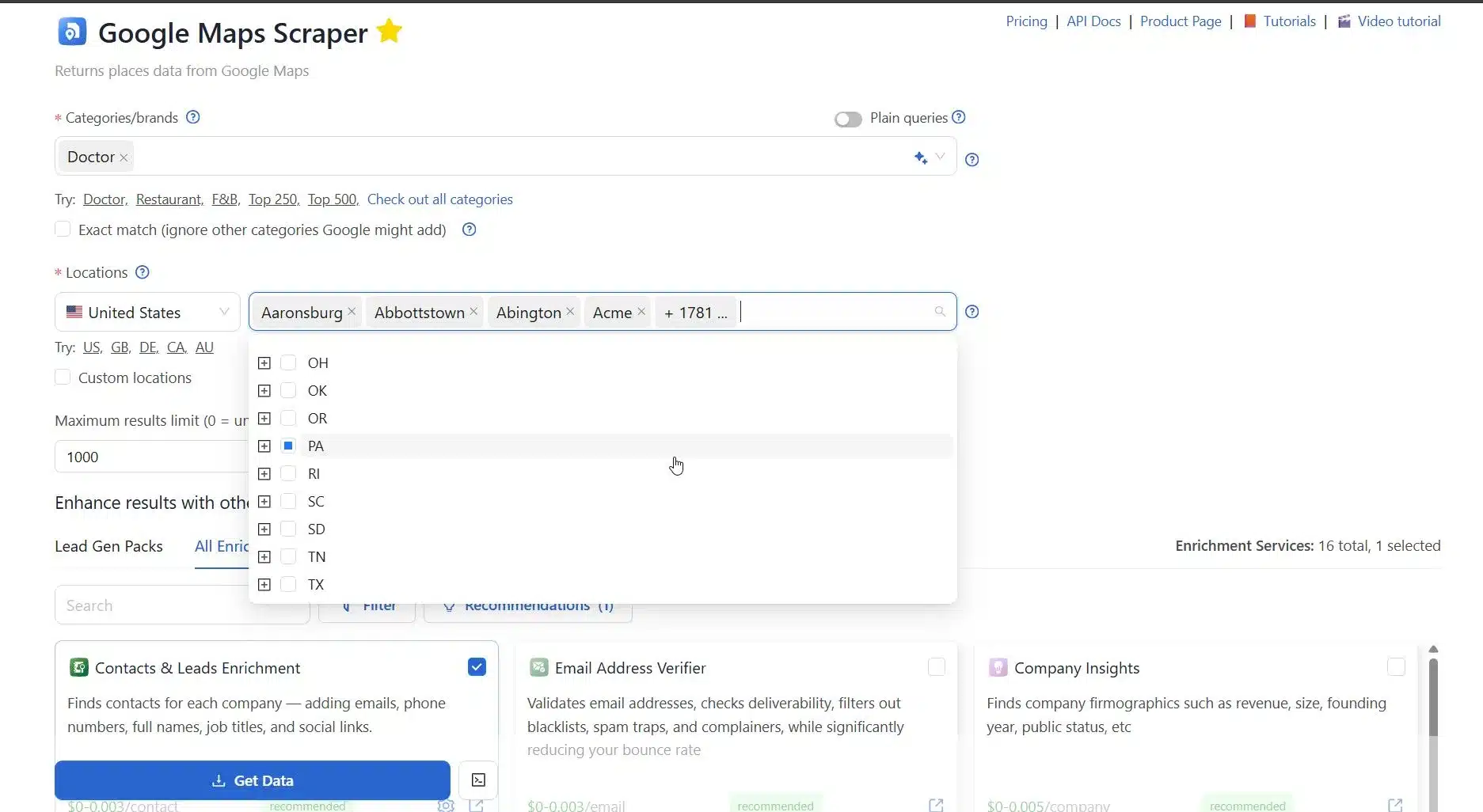 Once you’re inside Парсер Google Maps, all you need to do is to select a category. In this example, we will be getting data of all Doctors in the State of Pennsylvania in the United States of America (USA).