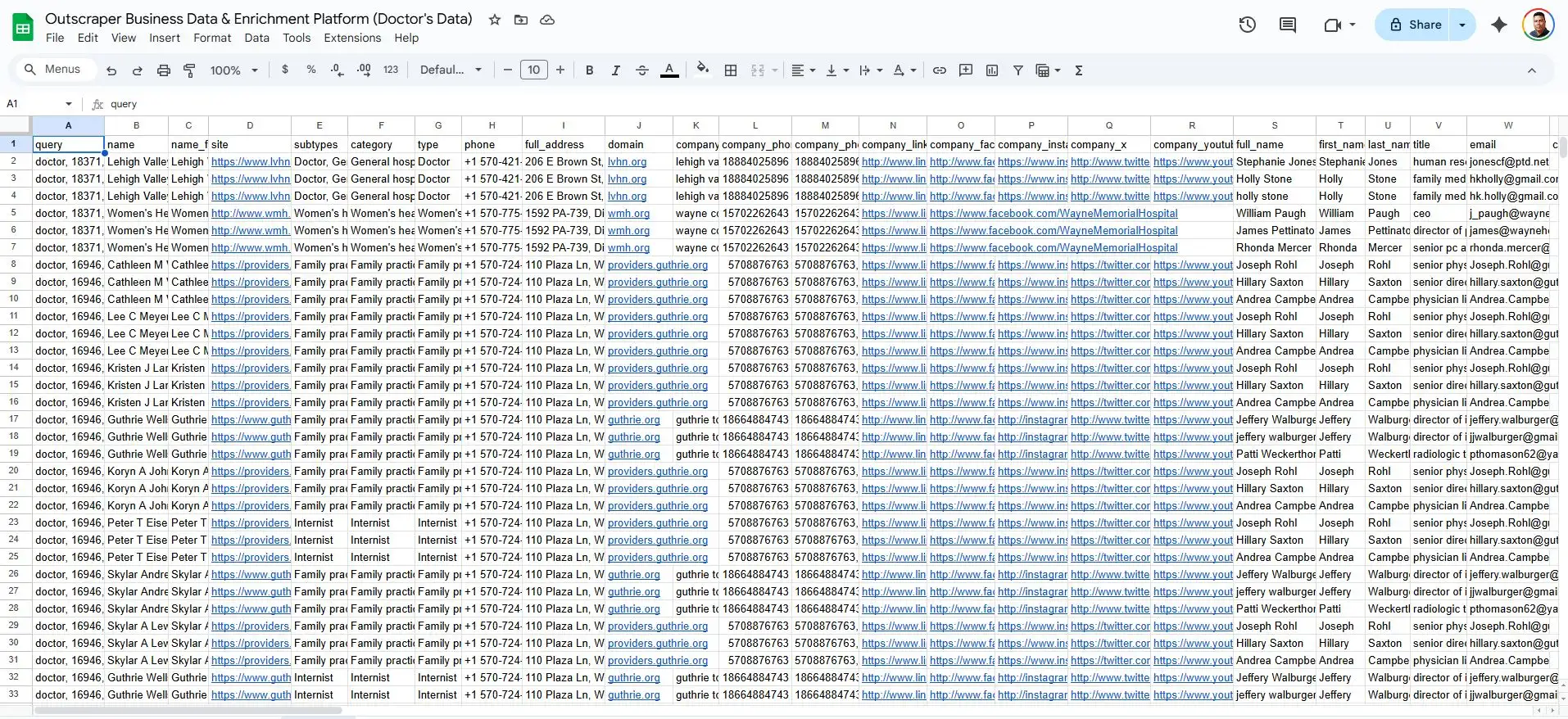 Doctors’ data without enrichment typically resembles a local directory. It includes clinic names, specialties, and addresses. Google listing details and general phone numbers. This information is useful for mapping and verification, but it offers little value for outreach or sales execution.