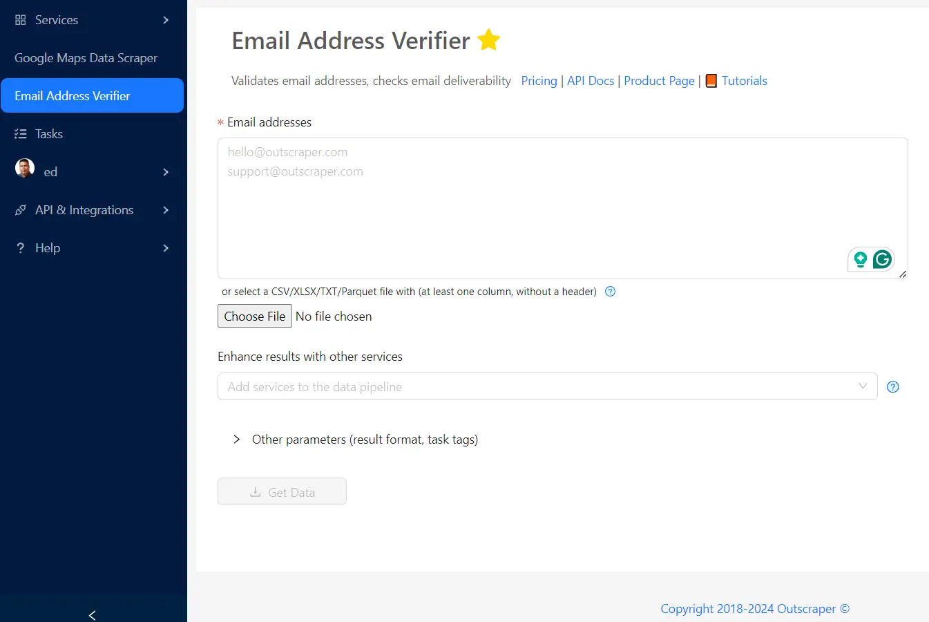 To initiate the enrichment process, just click “Get Data” if you have added the Advanced and Other Parameters already. You can track and monitor your progress in the Outscraper’s Task Page.