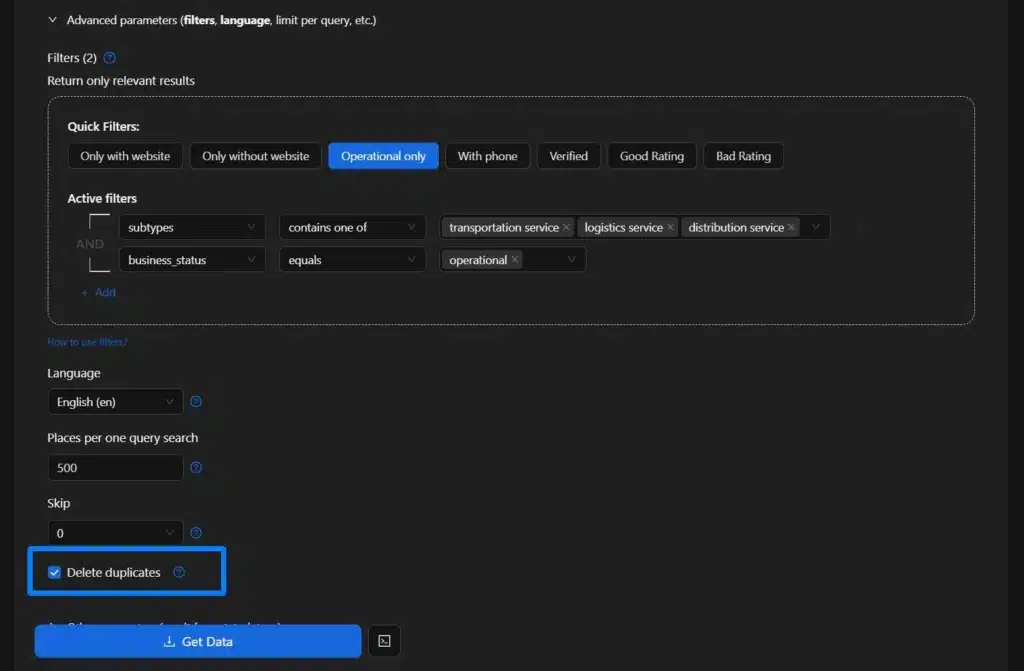 To add more relevant and specific data, you should apply some advanced parameter options, such as selecting businesses that are operational only. Make sure to check the Delete Duplicates options and Use ZIP codes options.